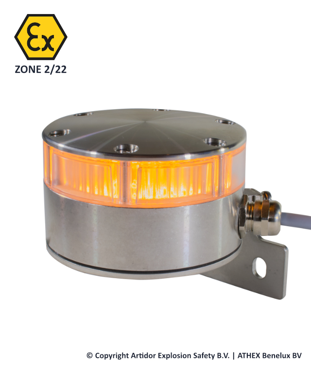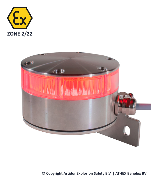 Het Artidor AR-043 LED signaallicht is explosieveilig en gecertificeerd in overeenstemming met Europese richtlijn 2014/34/EU (ATEX 114) en is CE gemarkeerd. Daarmee is het signaallicht geschikt voor gebruik in zone 2 en zone 22.
